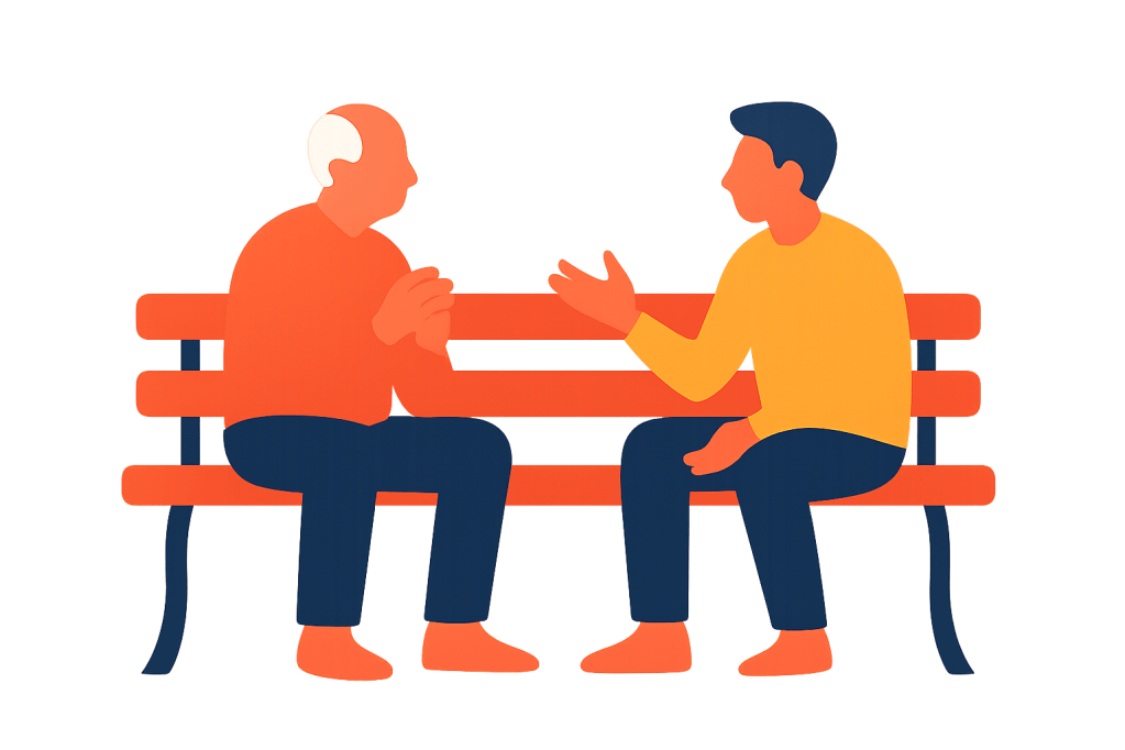 The sessions will follow a conversational style. You’ll introduce yourself and then you can decide what to talk about. Imagine having a cup of tea with a grandparent!